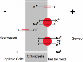 Der hohe Natrium-Gradient über der basolateralen Membran erzeugt eine positiv geladene Seite, während über der apikalen Membran eine negative Seite bildet. Die Na+ diffundieren nun durch den elektrochemischen Gradienten in das Meerwasser.