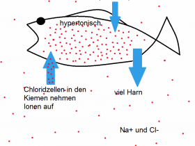 Bei Süßwasserfischen ist das Umgebungsmedium Wasser hypoosmotisch und der Körper hyperosmotisch. Die Ionen im Körper neigen dazu in das Außenmedium zu diffundieren und Wasser strömt in den Körper. Die Fische neigen dazu anzuschwellen.