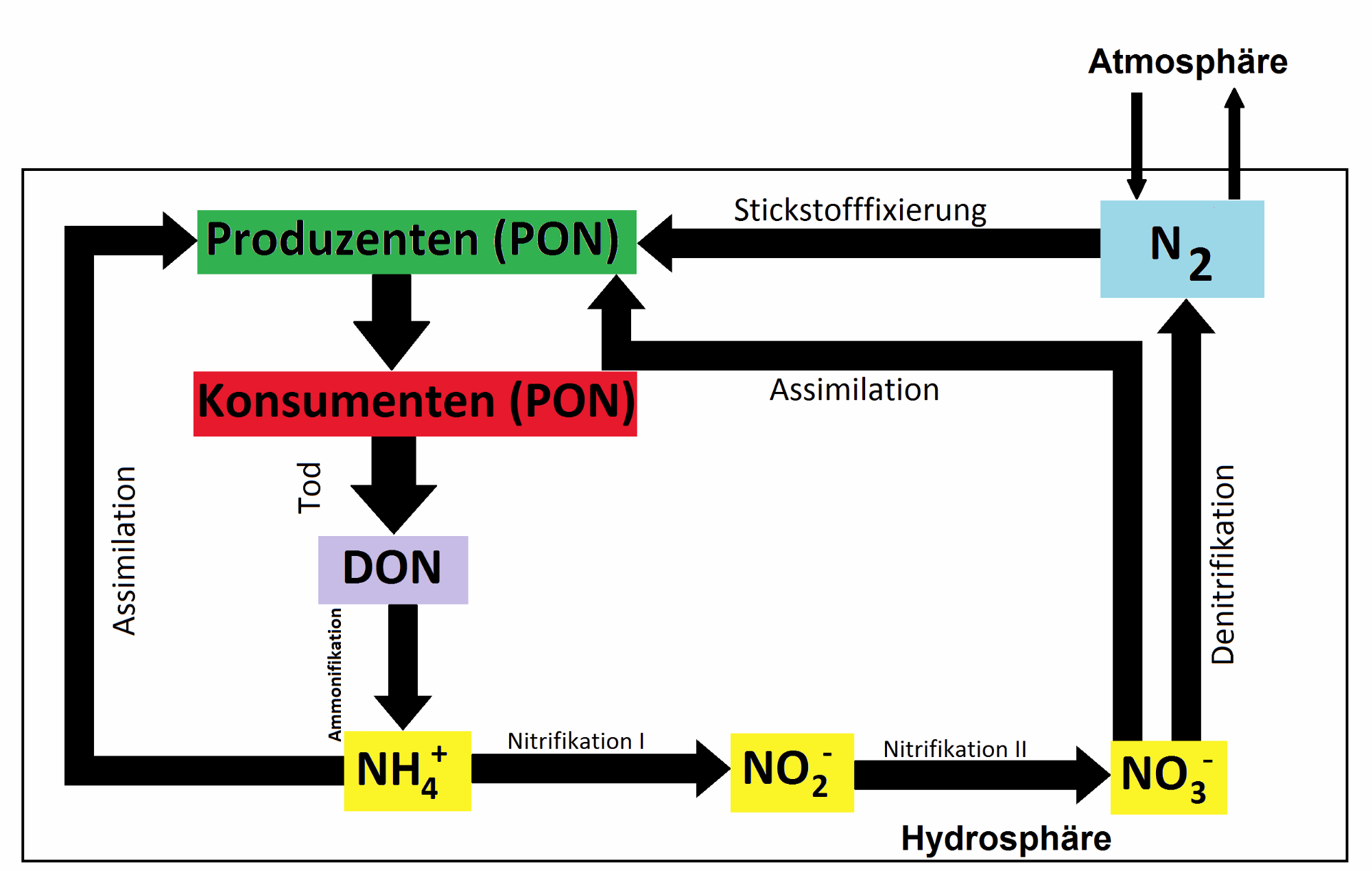 Durch Exkretion von Konsumenten und dem Tod von Produzenten und Konsumenten fällt gelöster organischer Stickstoff an.