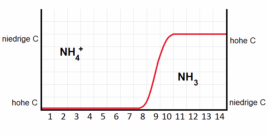 Ab pH 7 sind nur noch wenige Oxonium-Ionen vorhanden. Ammoniak reagiert dann auch mit Wasser.