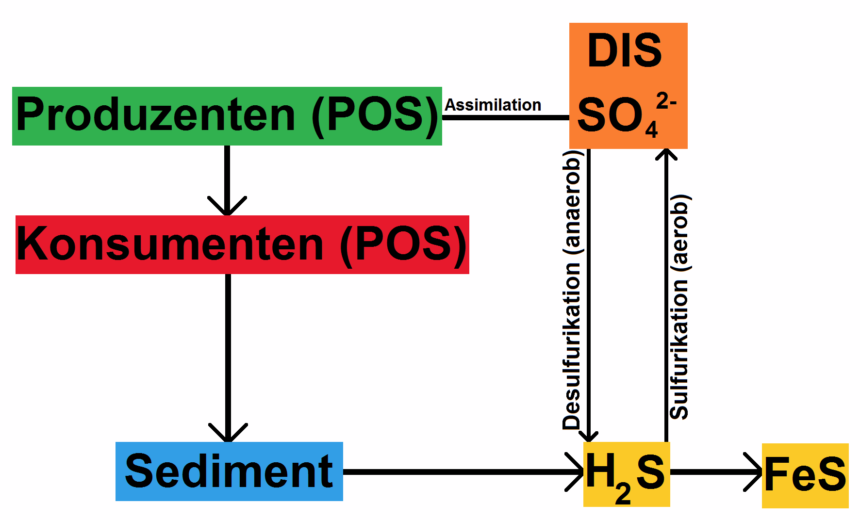Es gibt nur zwei Schwefel Stoffpools. Der partikuläre organische Schwefel Stoffpool besteht aus den lebenden Organismen, also Produzenten und Konsumenten. Der DIS (dissolved inorganic S) Stoffpool besteht aus Sulfat, Schwefelwasserstoff und Eisensulfid.