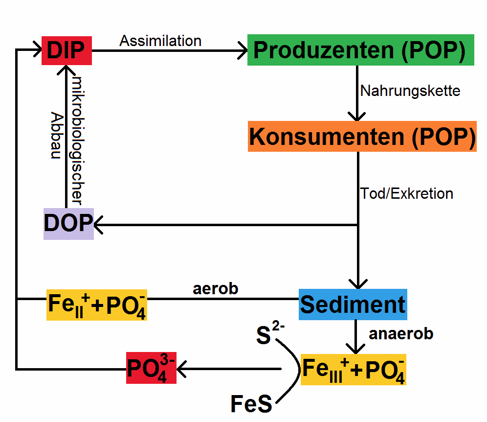 Durch die Exkretion und das Sterben von Konsumenten/Produzenten entsteht gelöster organischer Phosphor. Bakterien nutzen diesen zur Chemosynthese und speisen mit den Endprodukten wieder den DIP Stoffpool.