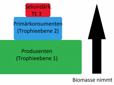 Die Tiere werden immer größer, brauchen daher auch mehr Nahrung und können sich deswegen nicht so extrem vermehren, sodass die Biomasse immer weiter abnimmt.