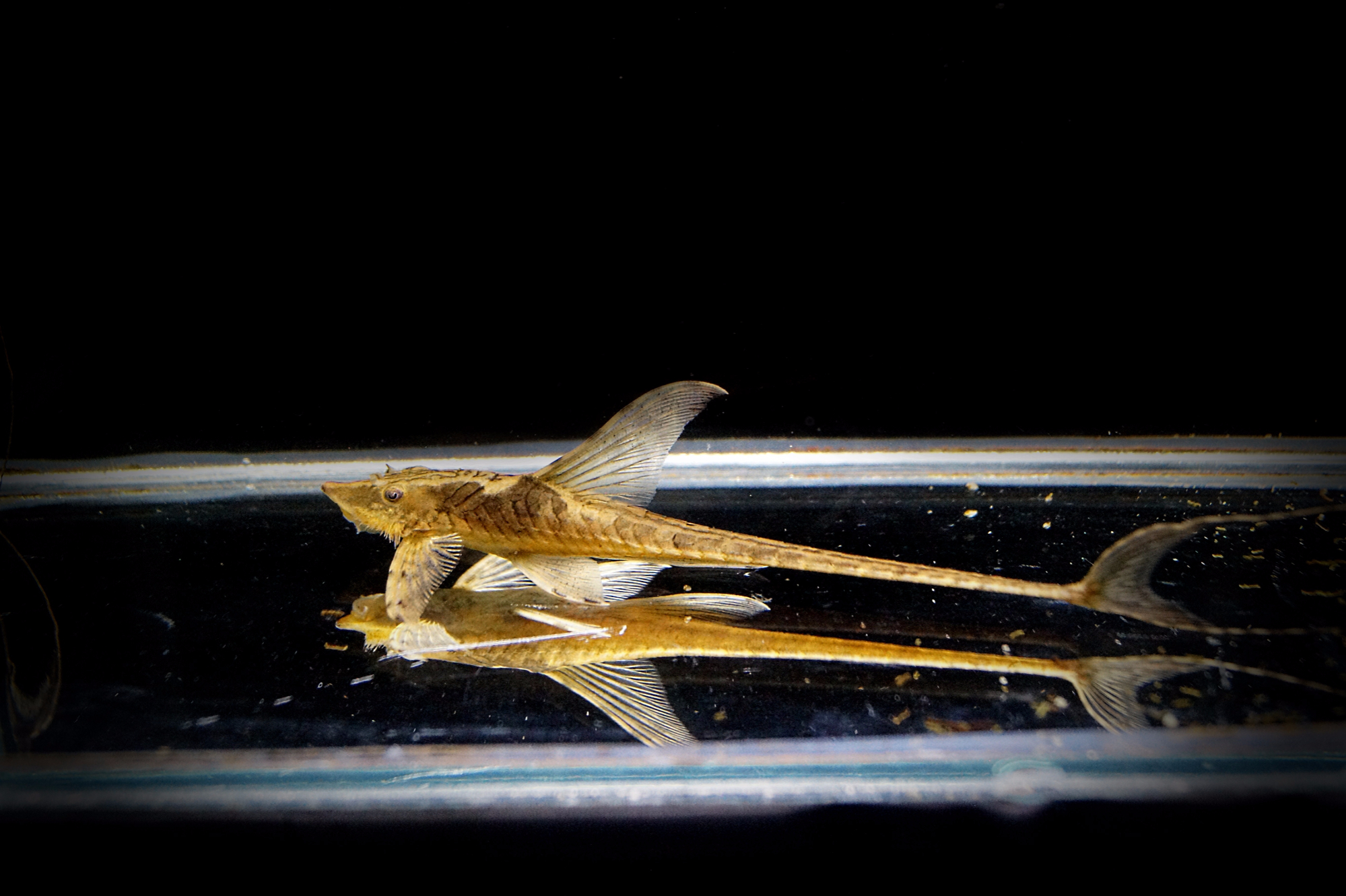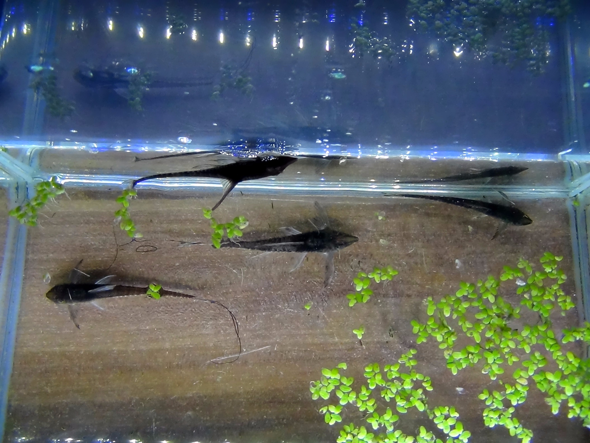 In den ersten 4-5 Wochen wachsen die Jungfische auf eine Größe von 1,5-2 cm heran und können in ein größeres Aufzuchtbecken (100 l) umgesetzt werden. Auf komplett gleiche Wasserwerte sollte dringendst geachtet werden, da die jungen Welse äußerst empfindlich gegenüber der Änderung der Wasserwerte sind. Nun kann von Spirulina-Tabs, Vipa-Chips, Gemüse, Lutschkieseln (Algen überwucherte Steine), getrockneten Walnussblättern und Forstfutter eine große Bandbreite an Futtersorten gereicht werden. Im Aufzuchtbecken sollte man unbedingt eine kleine Wurzel, für den Zellulosebedarf platzieren. In dieser Phase wachsen die Sturisoma verhältnismäßig langsam und es kann zu unerwarteten Ausfällen kommen, nach meinen Erfahrungen in der 4. Und 8 Woche. Mit regelmäßigen Wasserwechseln, guter Fütterung und einer Temperatur von 27°C erreichen die Langflossen Harnischwelse die 8 cm Abgabegröße. Nun sind sie robust genug in anderes Wasser gesetzt zu werden.