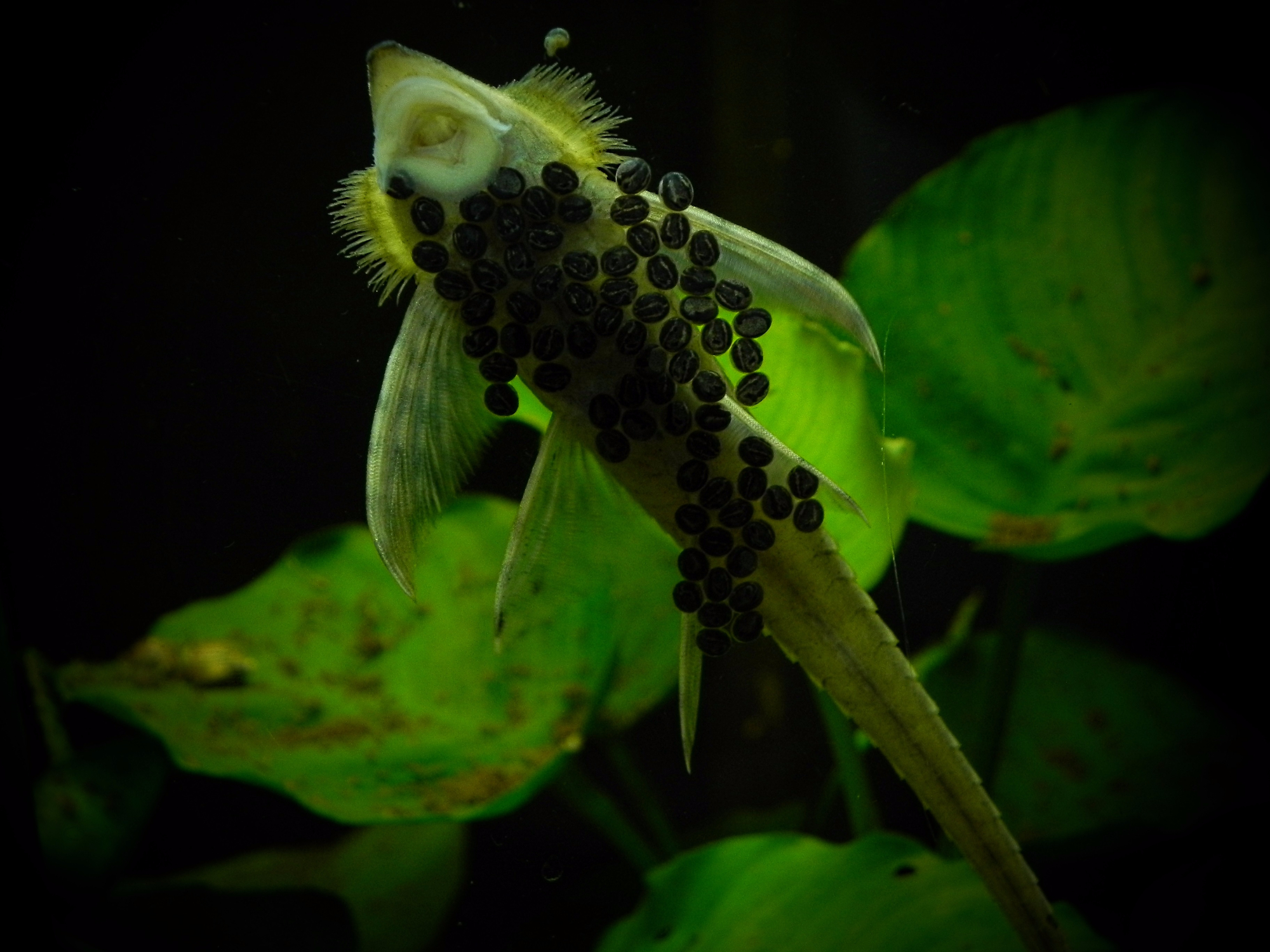 Bei einer Temperatur von 27,5°C und einem Leitwert von 180-270 mS schlüpfen die Sturisoma-Larven innerhalb von 7-8 Tagen. In dieser Zeit hilft das Männchen dem Nachwuchs beim Schlupf und raspelt die Eihülle auf. Die etwa 5-6 mm großen und dunkelbraun gefärbten Larven verlassen das Nest und schwimmen zügig in einen strömungsreichen Bereich knapp unter der Wasseroberfläche. Der Dottersack reicht für maximal 2 Tage, daraufhin benötigen die Larven den Kot der Eltern als Erstnahrung. Zusätzlich nehmen sie vorbeischwebende Futterpartikel auf. Bei der Zucht im Aquarium empfiehlt sich, die Tiere in einem Aufzuchtring/-kasten im Elternbecken zu separieren und mit einem Ausströmerstein gut zu durchlüften. Die besten Erfahrungen habe ich mit einer Futtermischung aus zerbröselten Spirulina-Tabs, Mulm und getrockneten Walnussblättern gemacht. Auf dem Laub bildet sich ein Bakterienrasen der von den Larven, anders als oft in der Literatur erwähnt, aktiv aufgesucht wird. Auf den Mulm im Aufzuchtbecken darf man nicht vergessen. Auf einen guten Wasseraustausch sollte man achten und zusätzlich jeden Tag den Dreck absaugen und neues Futter und Mulm hinzugeben.