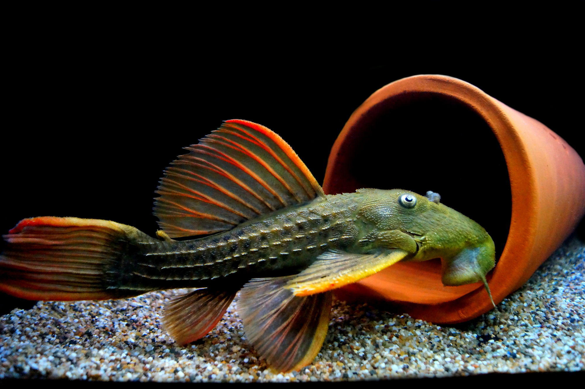 Ein weibliches Tier wird schon seit ca 2 Jahren in meinem Gesellschaftsaquarium mit Altums (P. altum Rio Orinoco), Brochis multiradiatus und Sturisomatychthis festivus gehalten. Das Aquarium hat eine Grundfläche von 100-130cm x 60 und eine Höhe von 80cm. Das Tier hatte beim Erwerb eine größe von 16-17cm und ist inzwischen ca 20 cm groß. Bei einer Temperatur von 27-28°C und einem Leitwert von 270-300 mS scheint sich das Tier wohl zu fühlen und zeigt ein prächtiges Farbenkleid. Tagsüber ist das Tier maximal ganz kurz beim Fressen außerhalb seines Versteckes zu sehen. Gegenüber den anderen Insassen ist das Tier nur bei der FVütterung etwas ruppiger, verscheucht diese jedoch nur beim Fressen und lässt sie ansonsten in Ruhe. Dieses Tier bevorzugt ein Versteck unter einer Holzwurzel und beachtet eine eingebrachte Keramik-Welshöhle garnicht. Der Bodengrund besteht aus Quarzsand in dem oft nach Futter gebuddelt wird (Nachts). Das Tier ist äußerst Scheu frisst jedoch alle angebotenen Futtersorten gut (Snail-, Artemiagranulat von Futterdose und Basslergranulat, sowie Tiefkühlmiesmuscheln. Neu im Bestand sind zwei männliche Exemplare mit rund 25cm, die jedoch getrennt in anderen Aquarien untergebracht sind. Diese haben auch gleich nach Eingewöhnung sämtliche Futtersorten gefressen und zeigen sehr viel weniger Scheu wie das weibliche Tier. Zu erkennen ist der deutlich ausgeprägtere Odontodenbewuchs sowie die deutlich prächtigere Färbung.